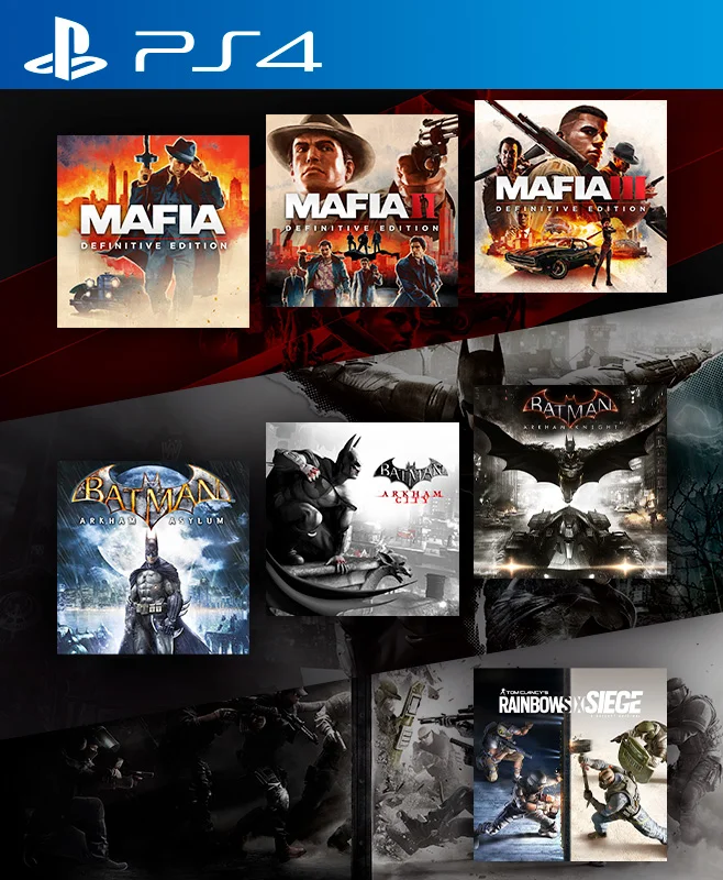 7 JUEGOS EN 1 Mafia Trilogy mas Batman Arkham Collection mas TOM CLANCYS RAINBOW SIX SIEGE PS4